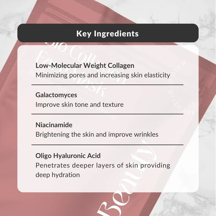 Angereichert mit einer kraftvollen Kombination aus niedermolekularem Kollagen, Galactomyces, Oligo-Hyaluronsäure und Niacinamid, dringt unsere Maske tief in die Hautstruktur ein und bekämpft Probleme direkt an ihrer Wurzel. Diese Inhaltsstoffe sind nicht einfach gemischt, sondern gezielt auf Basis führender wissenschaftlicher Forschung und klinischer Studien ausgewählt, um nicht nur Ergebnisse, sondern eine spürbare Hauttransformation zu gewährleisten.